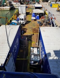TDI-Brooks has conducted more EBS projects over the last two (2) year in Mexico than any of our competitors all safely and efficiently without any incidences. TDI-Brooks remains focused on the planning, acquisition and analytical components of these ASEA required EBS projects. We team with Maxon Consulting who provides the regulatory and interpretative reporting components. To give you an idea of the back deck configuration of our equipment off a 3rd party vessel, below is an image from the MV L. AZUL showing lab, office and storage vans, stern and port-side A-frame, winches, pole-mount for USBL, etc.