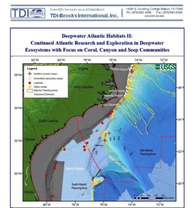 TDI-Brooks is pleased to announce that we have been awarded the Bureau of Ocean Energy Management (BOEM), the National Oceanic and Atmospheric Administration (NOAA) Office of Ocean Exploration and Research (OER), and the U.S. Geological Survey (USGS) funded study entitled “Deepwater Atlantic Habitats II: Continued Atlantic Research and Exploration in Deepwater Ecosystems with Focus on Coral, Canyon and Seep Communities.” This interagency five (5) year, multi-million dollar study will focus on the exploration and investigation of deepwater biological communities located in U.S. federal waters of the Atlantic Ocean, including offshore Virginia, North Carolina, South Carolina, and Georgia (figure below). The program focus is on hard substrate habitats, with some work related to soft bottoms and within the water column. Results of the completed program will provide energy resource information needs for future offshore leasing of the Outer Continental Shelf in the mid and south Atlantic regions and information on the continental slope ecosystems.
