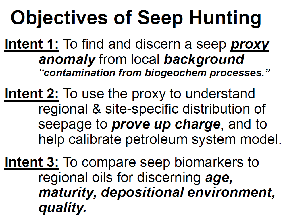 “Oil and gas seeps gave the first clues to many of the well-known onshore and offshore petroleum bearing basins historically found. Seep hunting surveys have been based on the observation that migrated petroleum from deep source rocks and reservoirs can be analytically detected or otherwise proxied as thermogenic seepage in near-surface soils and sediments, such that results can be used to help evaluate a prospective petroleum system. The value of survey results has been aided by the evolution of tools and techniques for site selection, sample collection, lab analysis, and interpretation, resulting in our growing ability to determine charge, age, maturity, depositional environment, and even oil quality