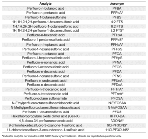 PFAS are found in numerous everyday items from non-stick or waterproof objects to some fast-food wrappers and stain resistant clothing. Environmental scientists are becoming more aware of the pervasiveness and diversity of these compounds and are working on ways to decrease or eliminate PFAS in the environment. B&B’s methods are optimized to detect a select group of 28 PFAS compounds (see table) to parts-per-trillion levels in all three matrices.