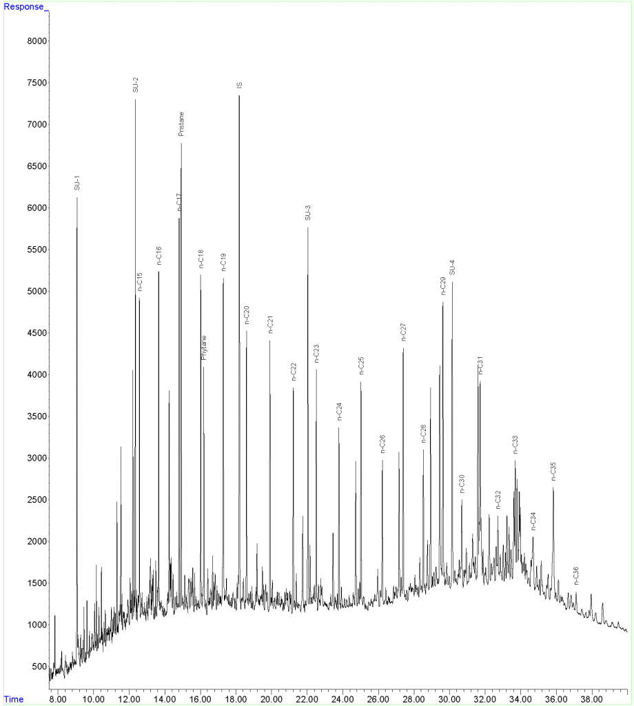 C15+ Hydrocarbon Determination refers to the determination of individual normal alkane hydrocarbons between 15 and 36 carbons. The determination also includes the isoprenoids pristane and phytane, and a determination of the unresolved complex mixture (UCM). The analytes are separated and detected by a flame ionization detector (GC/FID).