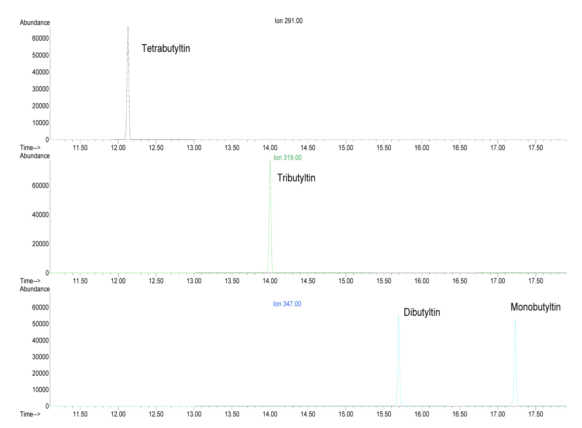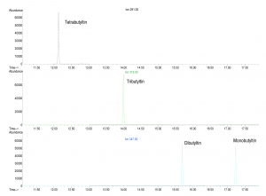 Butyltins are utilized in the industrial production of plastics and as fungicides/bactericides. Organotins in the form of TBT-based paints have largely been used to inhibit the growth of organisms on solid surfaces, such as ships immersed in fresh or salt water. However, as these compounds degrade into the water column, the butyltins are taken up by aquatic organisms, leading to growth abnormalities and increased mortality in certain aquatic organisms. Determination of tetrabutyltin (TeBT), tributyltin (TBT), dibutyltin (DBT) and monobutyltin (MBT) can be used to assess the extent of butyltin contamination in an ecosystem. TDI-Brooks offers the analysis of Butyltins. We routinely analyze sediment, water and tissue matrices as part of NOAA’s monitoring programs around the United States. This analysis involves the extraction, derivitization, and analysis of TeBT and TBT and its degradation products DBT and MBT from soil, tissue, and water matrices and determined using gas chromatography/mass spectrometry (GC/MS) in selected ion monitoring (SIM) mode at sub parts per billion levels.