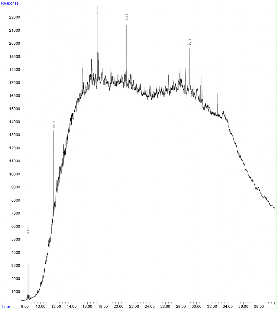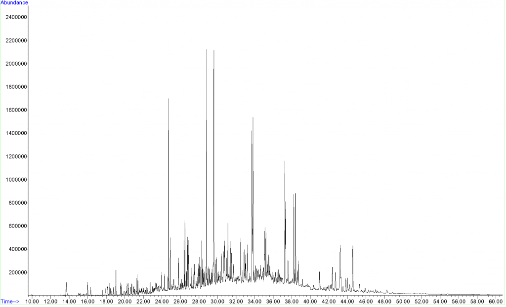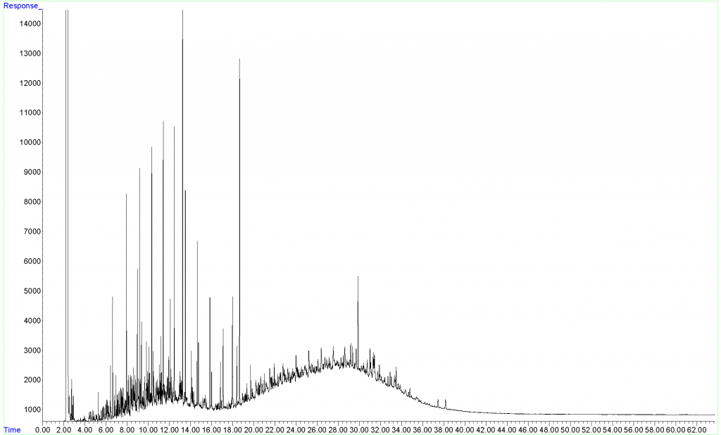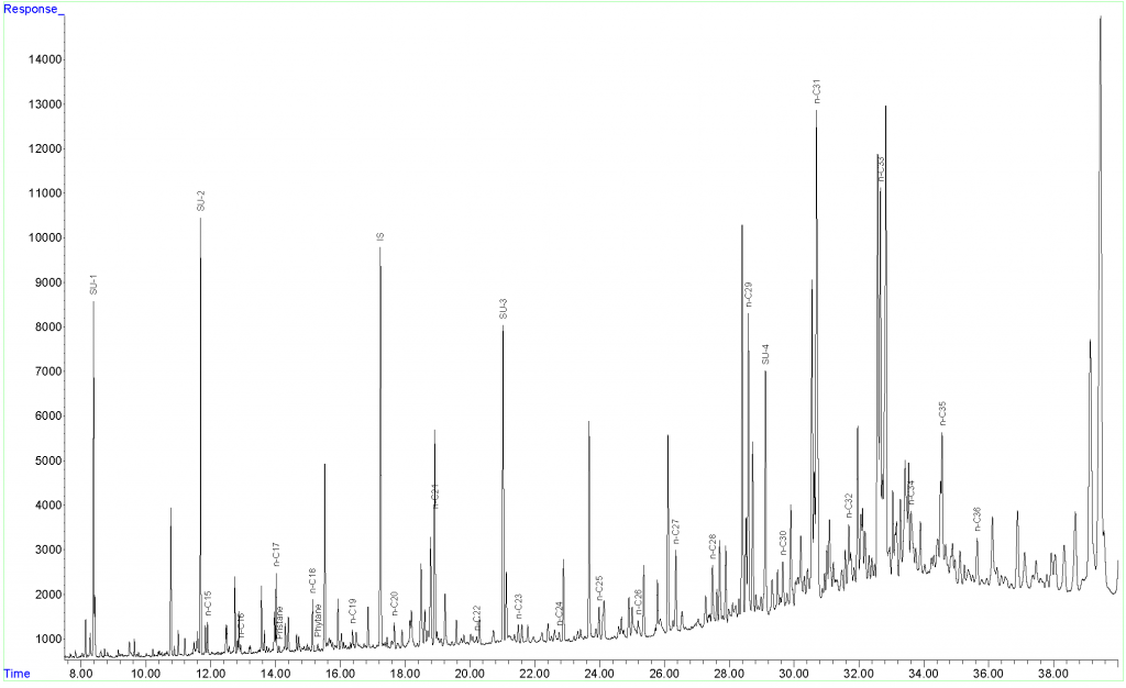 C15+ Hydrocarbon Determination refers to the determination of individual normal alkane hydrocarbons between 15 and 36 carbons. The determination also includes the isoprenoids pristane and phytane, and a determination of the unresolved complex mixture (UCM). The analytes are separated and detected by a flame ionization detector (GC/FID).