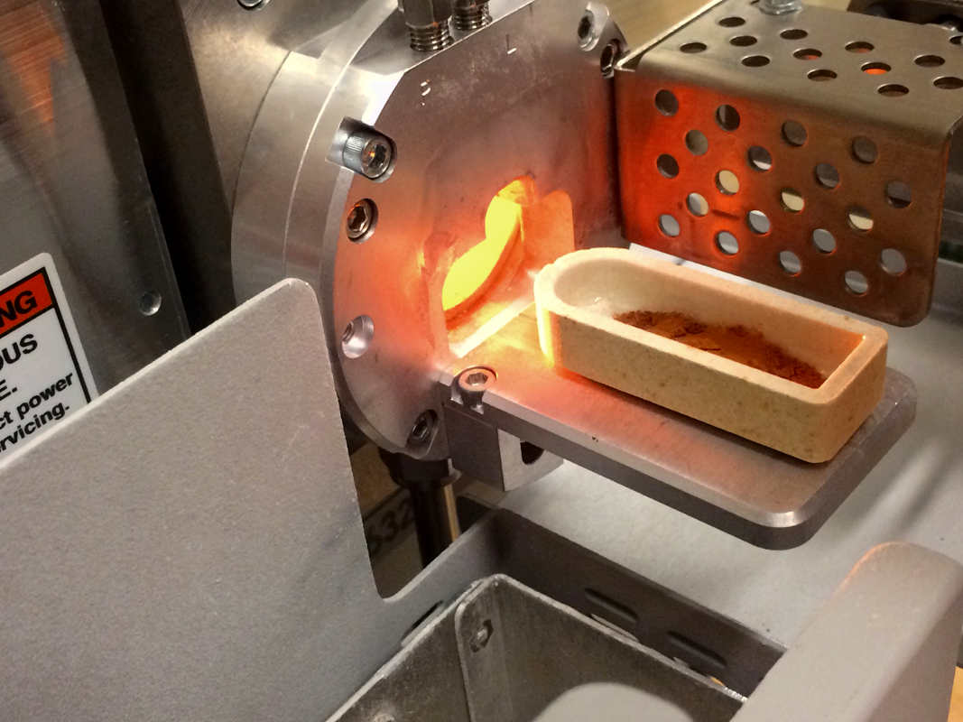 Stable carbon isotopic ratios of each of the light hydrocarbons are often used to clarify gas source for samples that have sufficient concentrations of the individual gas components. Such isotopic compositions of thousands of natural gas samples have been reported in the literature or reside in various prospecting databases. Obtaining accurate stable carbon isotope ratios of well gases has become commercially routine, because the individual concentrations of the alkane gases are typically high enough for baseline separation and robust determination by isotope ratio mass spectrometry (IRMS). However, the concentrations of these individual alkanes in soils and sediments range down below one ppmV (µL gas per L soil). These low concentrations are easy to detect using gas chromatography with flame ionization detection (GC/FID), but have been insufficient for reliable measurements of the carbon isotopic ratios of the individual light hydrocarbons. A diagram and photo are presented below.