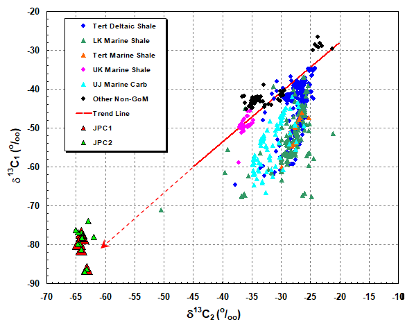 Below is a plot of the interstitial gas compositions from 12-m deep Jumbo piston core (JPC) samples, plotting the carbon isotopic composition of methane vs. that of ethane. The red line indicates the empirical trend line for this gas isotope pair from a worldwide sampling of natural gases. Samples plotting close together on the line indicate a co-genetic source of thermogenic gas. The JPC seep samples are plotted as indicated in the legend. We believe the ethane in these samples to be microbially produced (as is the methane) or even more likely to be the diagenetic daughter product of decomposing and very labile microbially produced ethene. The ethane isotopic ratios reported here were isotopically lighter than -60o/oo vs. VPDB, which is lighter than even the least mature thermogenically-derived ethane considered in the literature.