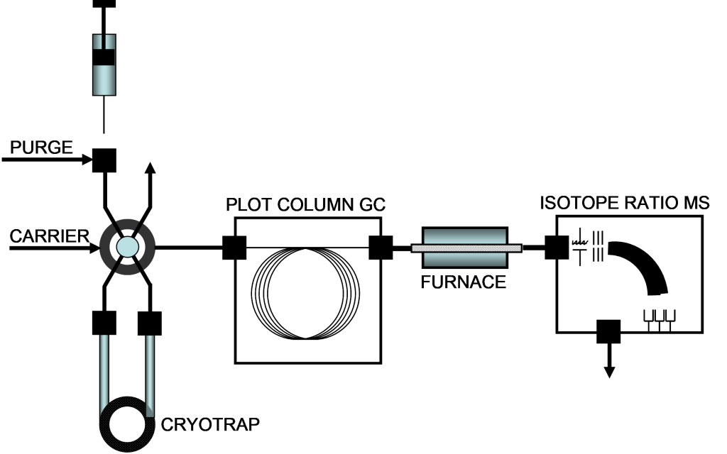 Method: As much as a liter of gas with traces of light hydrocarbons, such as an atmospheric sample or the equilibrated headspace from a canned soil or sediment sample, is stripped of moisture and adsorbed onto a cryo-trap held at near LN2 temperature. After this cryo-trapping concentration step, the analyte light hydrocarbons are thermally desorbed with helium onto to a PLOT GC column for separation. Each gas component passes in turn through a combustion furnace, quantitatively combusting each eluting light hydrocarbon. The resulting CO2 is then split such that a desired fraction enters the vacuum chamber of the isotope ratio mass spectrometer for ratio measurement against a standard isotope mixture. Accuracy and precision are both better than ± 1o/oo for even low concentrations of gas.