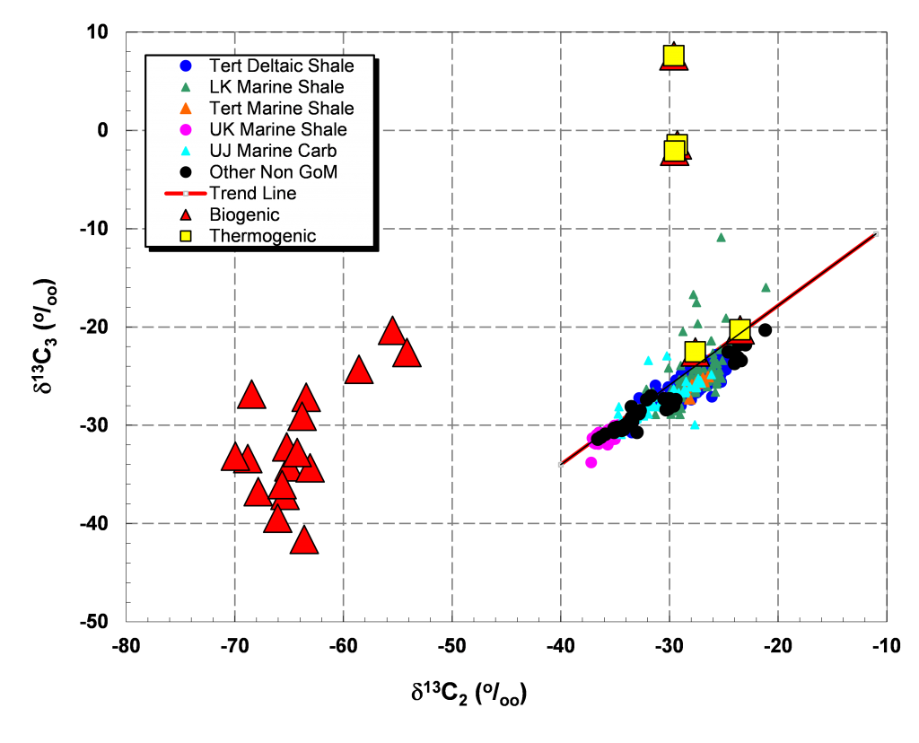 Below is a plot of the interstitial gas compositions from several recently acquired 5-m deep piston core samples, plotting the carbon isotopic composition of propane vs. that of ethane. The red line indicates the world-wide empirical trend line for this gas isotope pair. The piston core interstitial gas samples are plotted as red triangles, some overlain with yellow squares. These are among the few such sets of data ever generated due to the low, sub-5 ppmV concentrations of these gases in the seabed sediments. We believe the ethane and propane in samples marked as red triangles to be microbially produced or even more likely to be the diagenetic daughter products of decomposing and very labile microbially produced olefins. The ethane and propane in samples marked with yellow squares, however, may be of thermogenic origin, but we also are finding some low-concentration thermogenic propanes that appear to be fractionated isotopically heavier, perhaps by propane-preferential microbial activities.