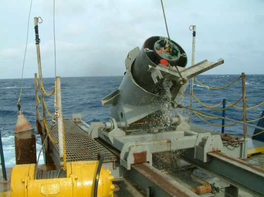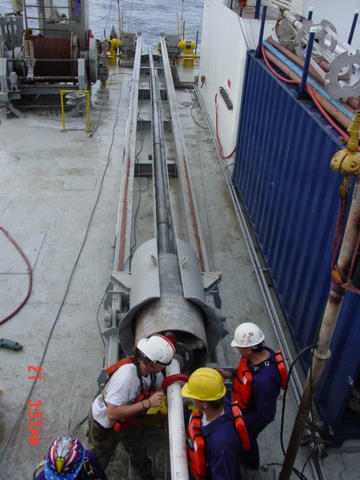 Figure 1. Recovery of the 65-ft, 6,000-lb, 4-inch Jumbo Piston Corer onboard