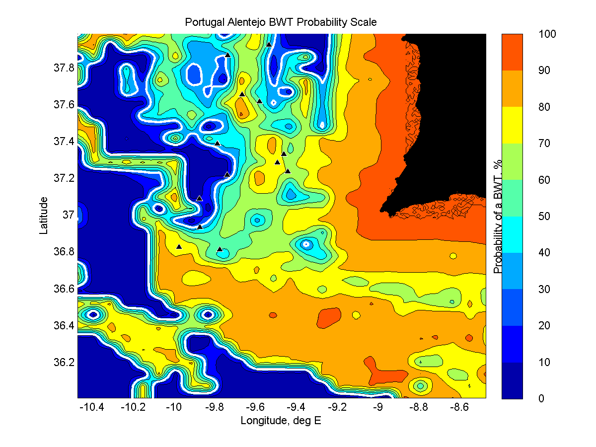 Figure 1: Probability of a BWT transient offshore of Portugal. The heat flow sites are denoted with a black triangle.