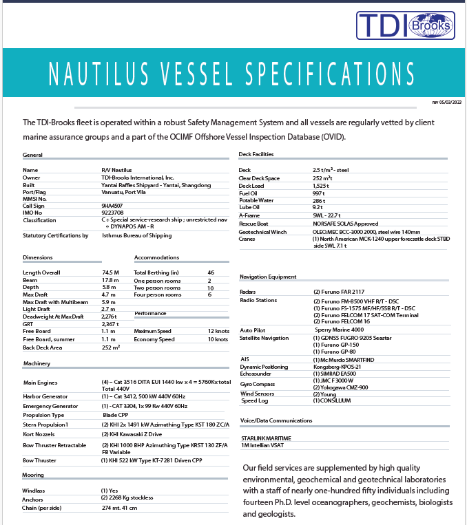 In addition to these tools, the R/V NAUTILUS is equipped with Geomil Manta-200 CPT, Neptune 3K & 5K vibracorers, and a specially designed pneumatic vibracorer engineered and fabricated by TDI-Brooks. These tools enable efficient and accurate geotechnical surveys and sampling.
