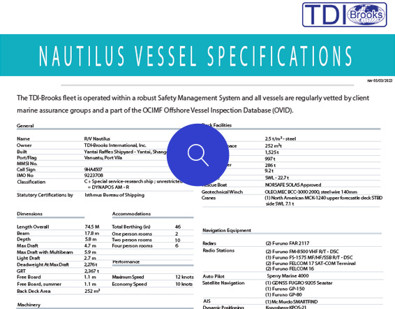 The R/V NAUTILUS is operated within a robust Safety Management System and all vessels are regularly vetted by client marine assurance groups and a part of the OCIMF Offshore Vessel Inspection Database (OVID).