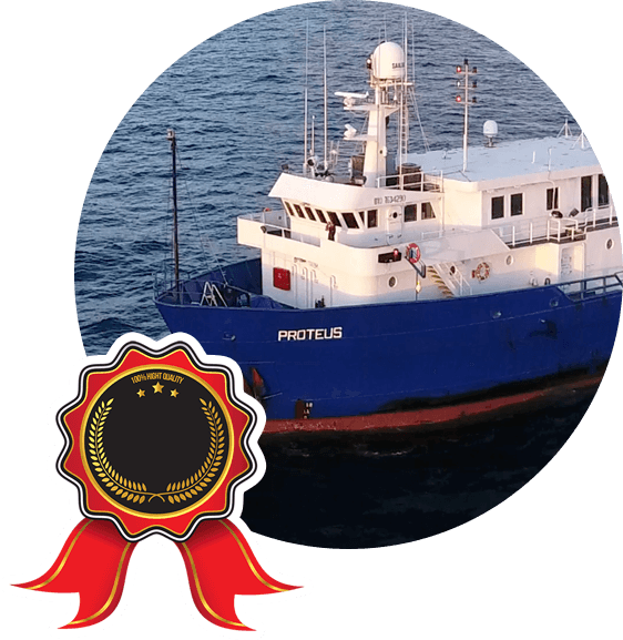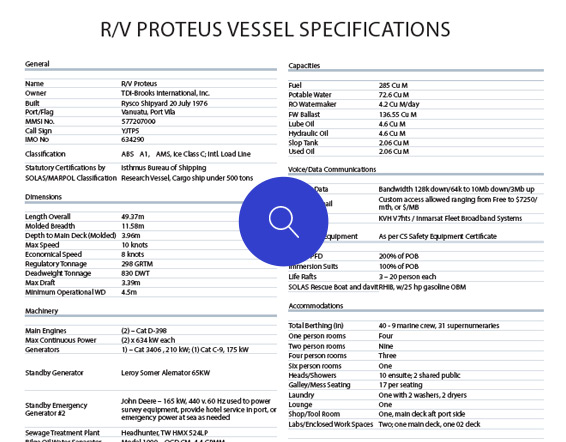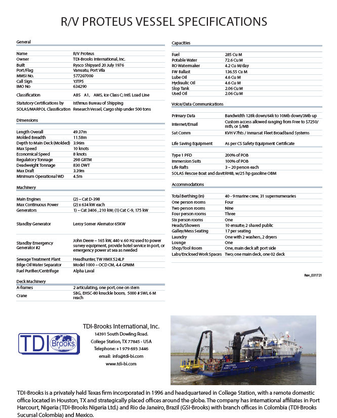 The R/V Proteus is equipped with satellite communications (phone and internet access), differential GPS, geophysical survey gear and large A-frames with high-speed winches for coring or geotechnical work. The R/V Proteus is an ABS class and had an extensive technical refit in 2009 and 2014 making her ready for extended voyages.