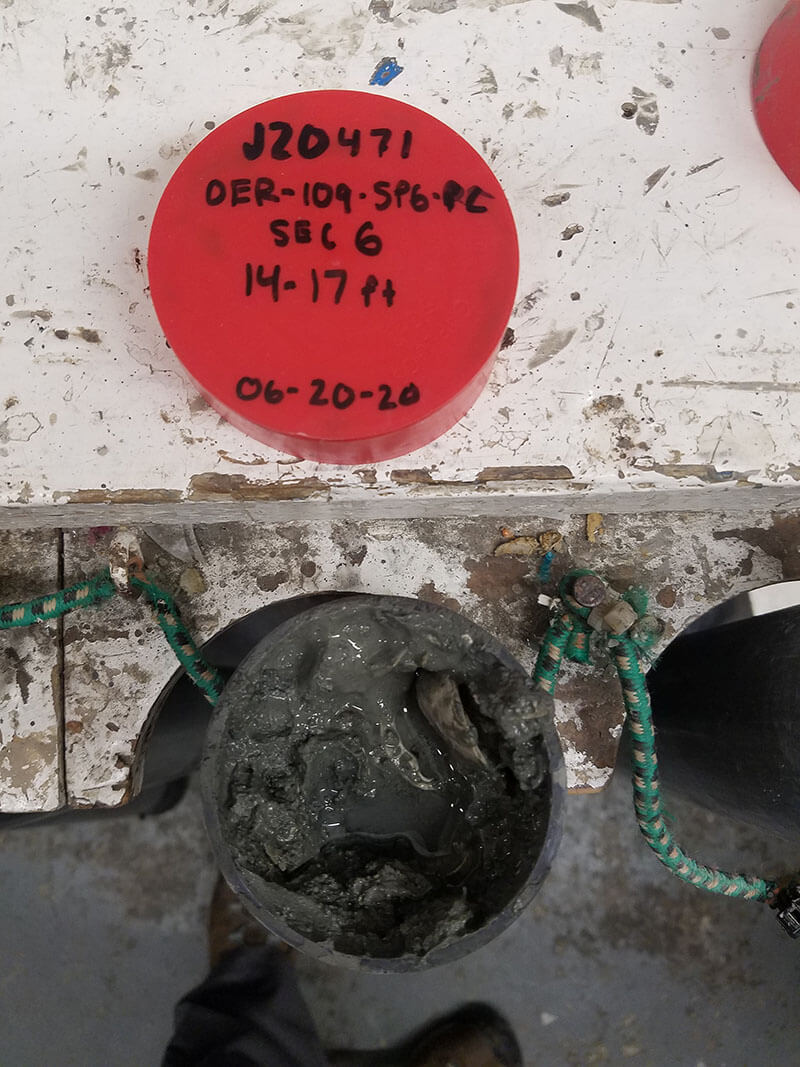 A digital photograph is taken and a visual description of each section is recorded. Lab testing as outlined in the Field Sediment Testing Protocol is performed and the top of the core section is capped. Top and bottom caps are securely taped to the liner. The core sections are stored and secured in a vertical position with the deeper portion of the section on the bottom. The core sections are stored in a manner to minimize individual movement with vessel heave, pitch, and roll. After completion of the coring activities, the core sections are delivered to TDI-Brooks’ onshore geotechnical testing laboratory in a timely, uninterrupted manner.