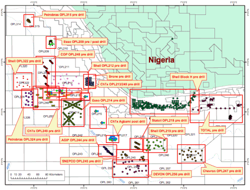 During 2006, TDI-Brooks using the R/V JW POWELL completed additional pre-drill environmental baseline survey (EBS) cruises in Nigeria for Chevron (OPL-247) Petrobras (OPL-315), Statoil (OPL-218) and SHELL through FugroNigeria in OPL-245, 322 and Block H, respectively. Figure 1 shows an updated map of all the pre- and post-drill EBSs that TDI-Brooks has conducted offshore Nigeria using the R/V GEOEXPLORER and R/V JW POWELL over the last three years. Our vessels have conducted virtually all the deep water EBSs in Nigeria over the last four (4) years.